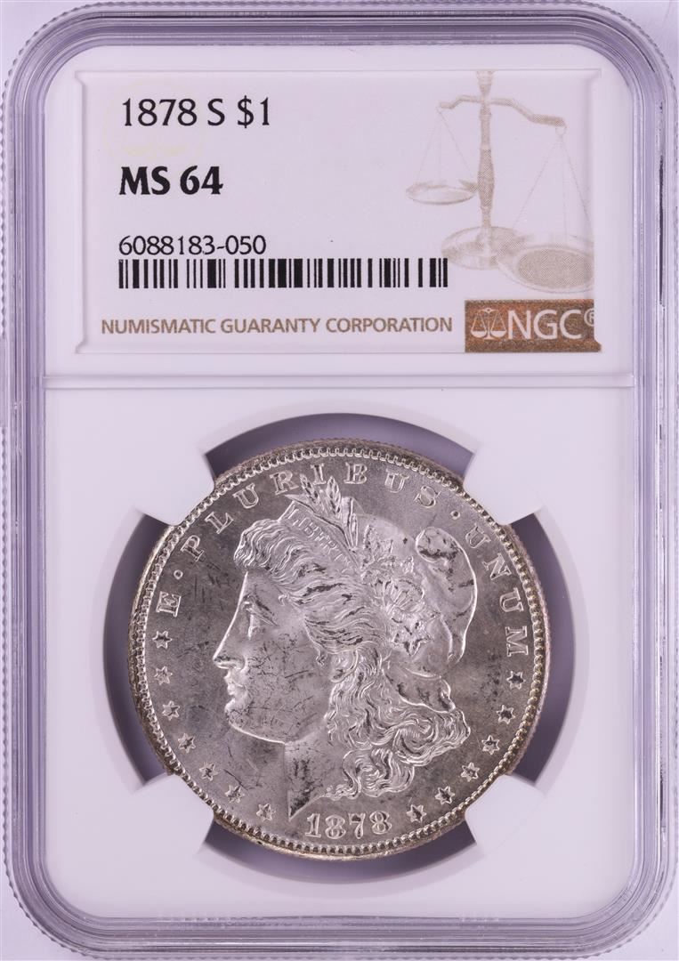 One 1878-S $1 Morgan Silver Dollar Coin NGC MS64. NGC Certified.