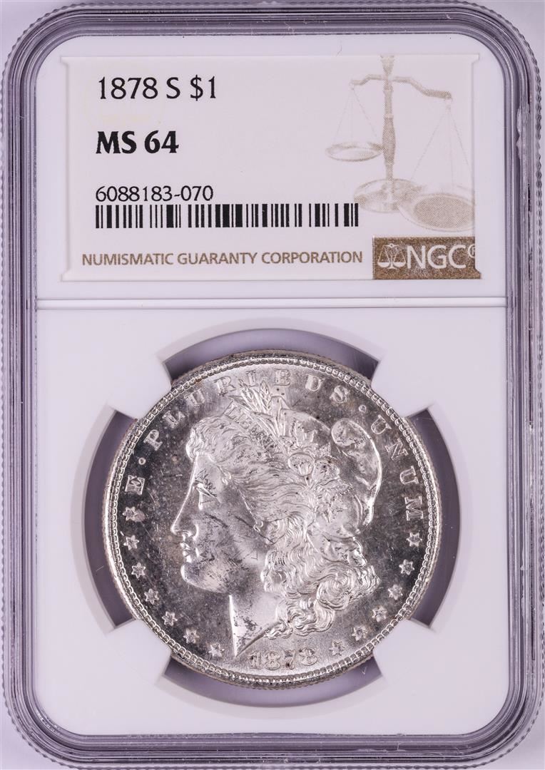 One 1878-S $1 Morgan Silver Dollar Coin NGC MS64. NGC Certified.