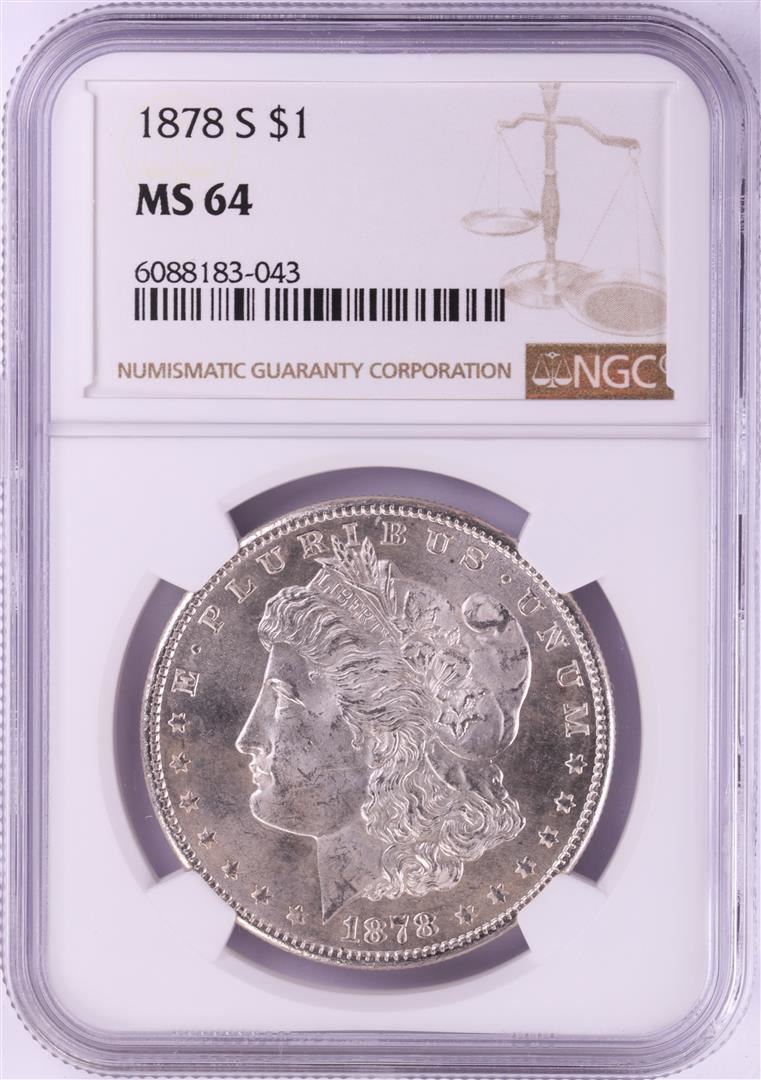 One 1878-S $1 Morgan Silver Dollar Coin NGC MS64. NGC Certified.