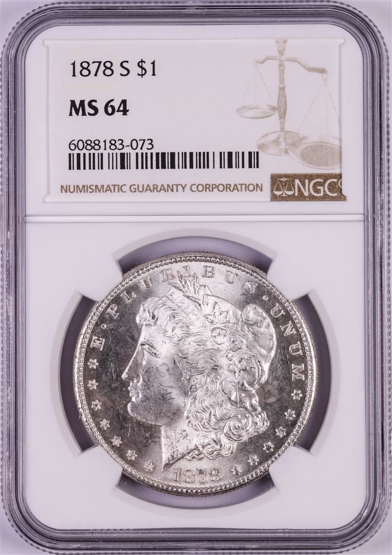 One 1878-S $1 Morgan Silver Dollar Coin NGC MS64. NGC Certified.