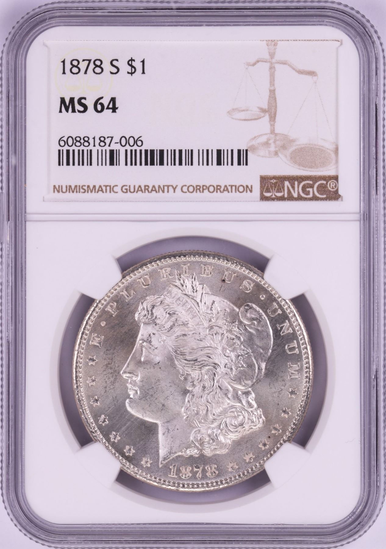 One 1878-S $1 Morgan Silver Dollar Coin NGC MS64.