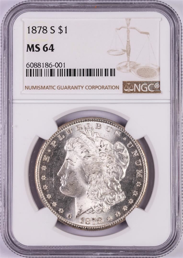 One 1878-S $1 Morgan Silver Dollar Coin NGC MS64. NGC Certified.