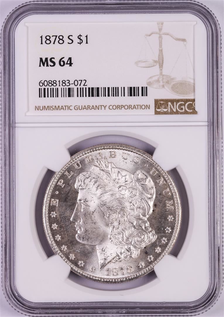 One 1878-S $1 Morgan Silver Dollar Coin NGC MS64. NGC Certified.
