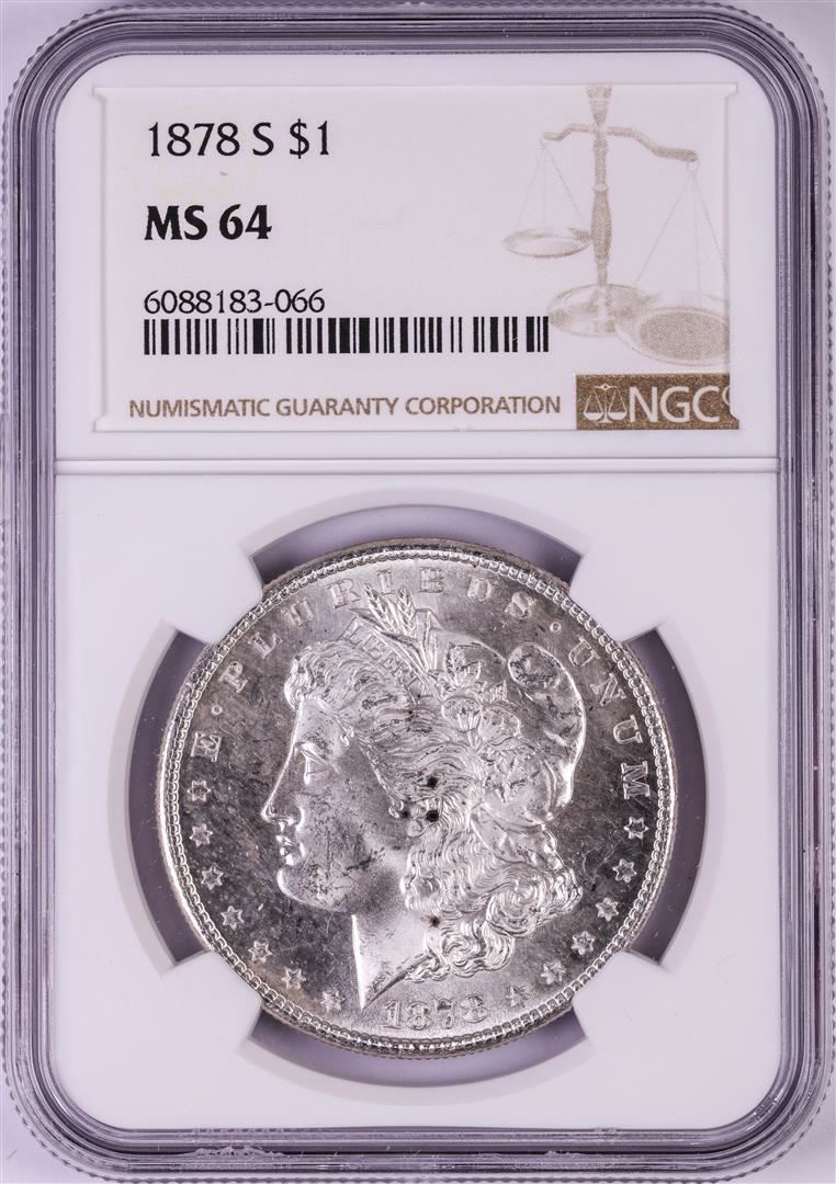 One 1878-S $1 Morgan Silver Dollar Coin NGC MS64. NGC Certified.