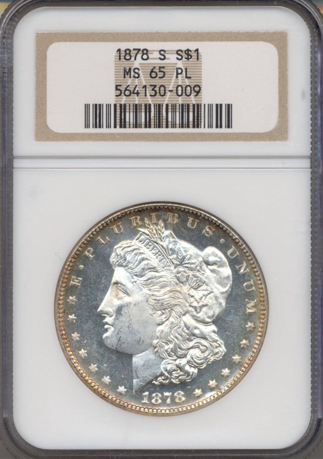 One 1878-S $1 Morgan Silver Dollar Coin NGC MS65PL.