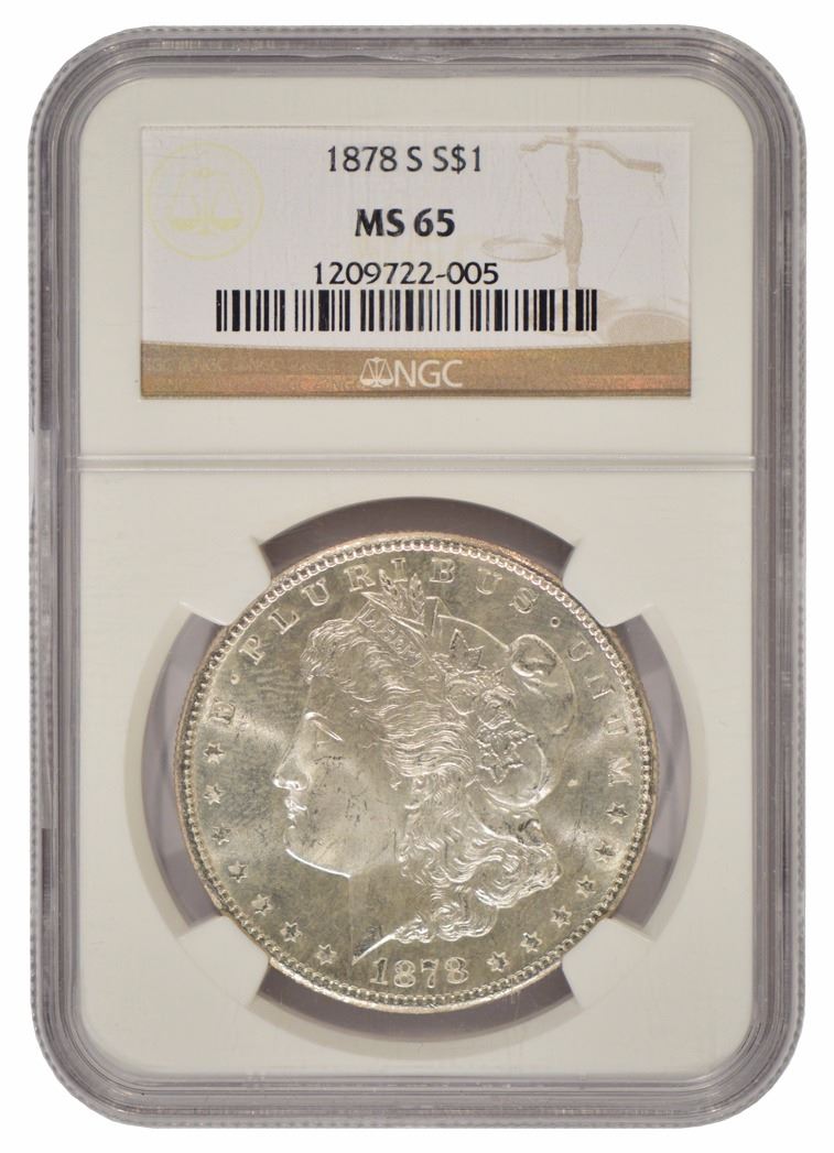 One 1878-S $1 Morgan Silver Dollar Coin NGC MS65.