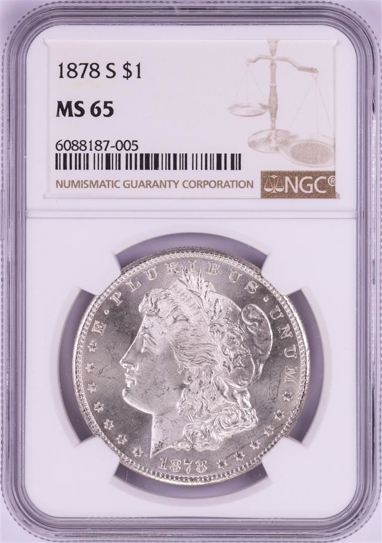 One 1878-S $1 Morgan Silver Dollar Coin NGC MS65. NGC Certified.