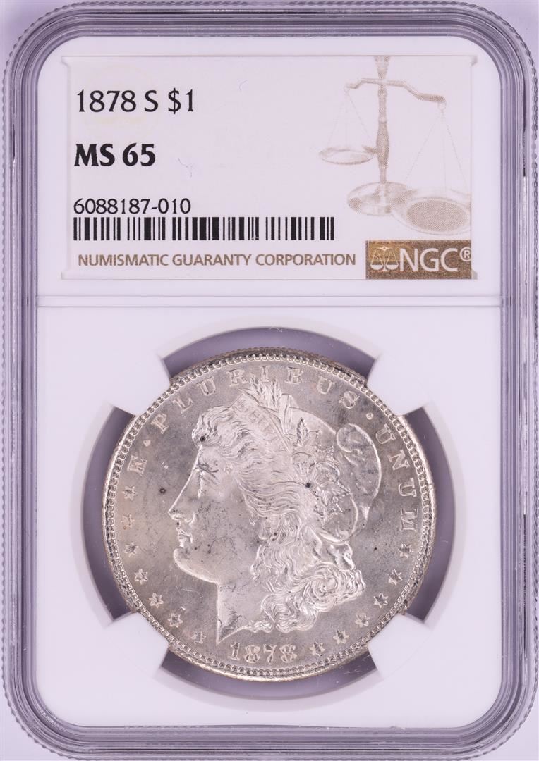 One 1878-S $1 Morgan Silver Dollar Coin NGC MS65. NGC Certified.