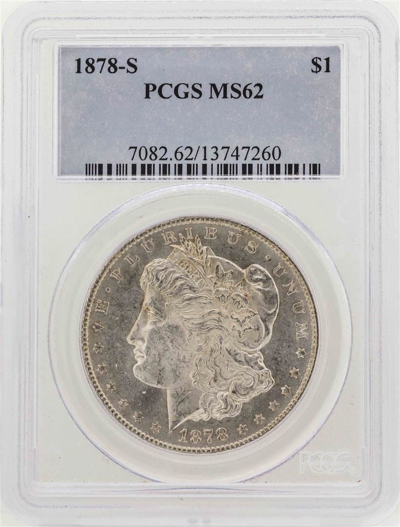 One 1878-S $1 Morgan Silver Dollar Coin PCGS MS62. PCGS Graded.