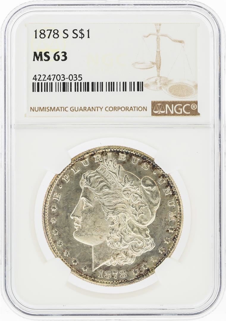 One 1878-S $1 Morgan Silver Dollar NGC Graded MS63. NGC Certified.