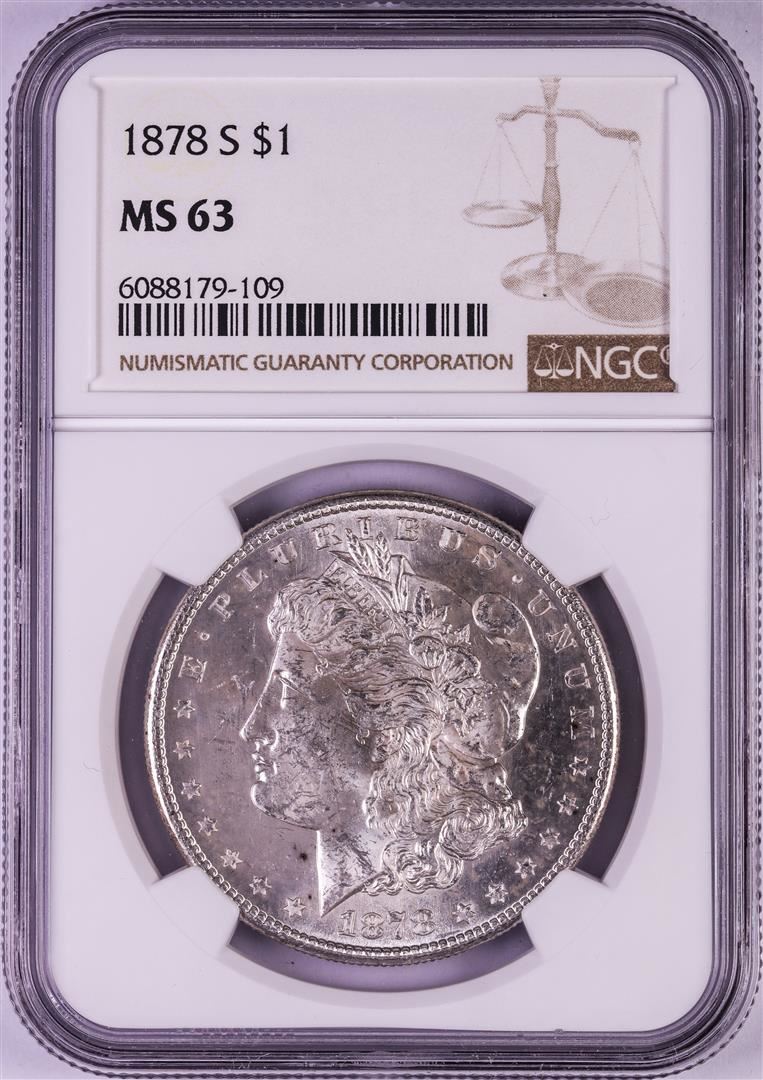 One 1878-S $1 Morgan Silver Dollar NGC MS63. NGC Certified.