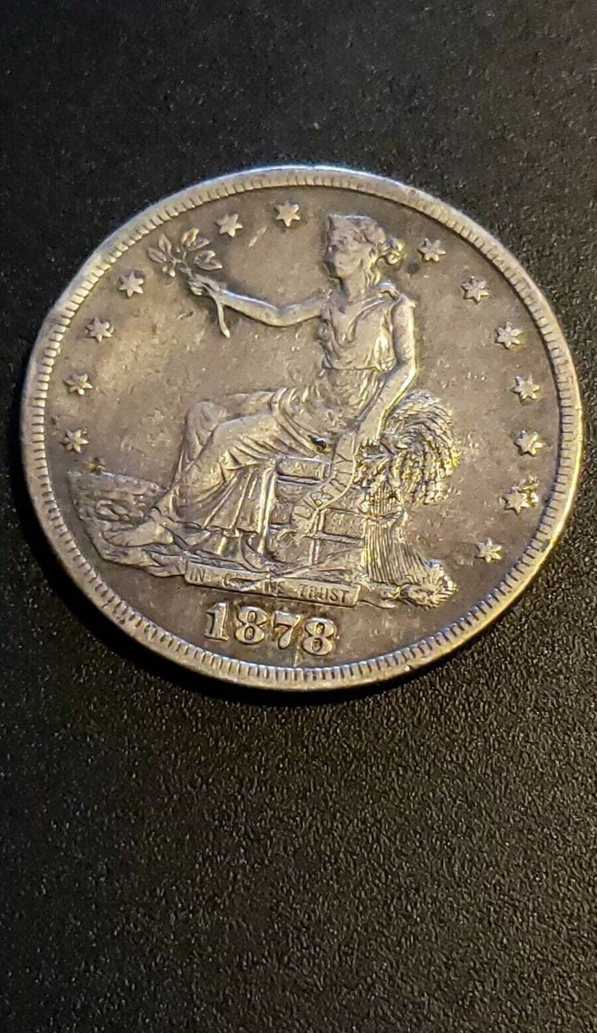 One 1878-S $1 Trade Dollar Coin.