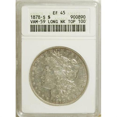 <B>1878-S $1 Long NK XF45 ANACS.</B></I> VAM-59, Top-100. NGC Census: (12/22574). PCGS Population (16/24107). Mintage: 9,774,000. Numismedia Wsl. Price for NGC/PCGS coin in XF45: $18. (#7082)<BR><BR><B>Coin Engraver:</B> George T. Morgan<BR><BR><b>Shipping:</b> Coins & Currency (<a target="_blank" href="http://www.heritageauctions.com/common/shipping.php">view shipping information</a>)
