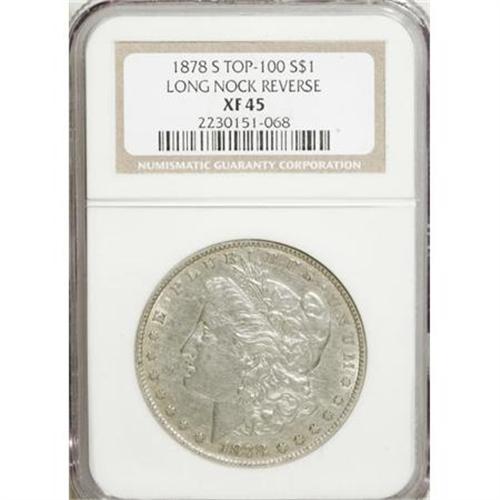 <B>1878-S $1 Long Nock Reverse XF45 NGC.</B></I> A Top 100 variety. NGC Census: (12/22111). PCGS Population (14/23884). Mintage: 9,774,000. Numismedia Wsl. Price for NGC/PCGS coin in XF45: $18. (#7082)<BR><BR><B>Coin Engraver:</B> George T. Morgan<BR><BR><b>Shipping:</b> Coins & Currency (<a target="_blank" href="http://www.heritageauctions.com/common/shipping.php">view shipping information</a>)