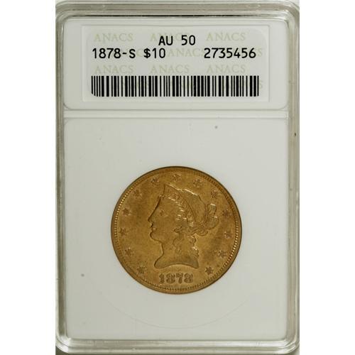 <B>1878-S $10 AU50 ANACS.</B></I> Mint State examples of this issue are quite rare, and as such this piece is a pleasing and affordable alternative, with semiprooflike fields and a relative paucity of abrasions on the yellow-orange surfaces.<BR><BR><b>Shipping:</b> Coins & Currency (<a target="_blank" href="http://www.heritageauctions.com/common/shipping.php">view shipping information</a>)