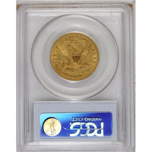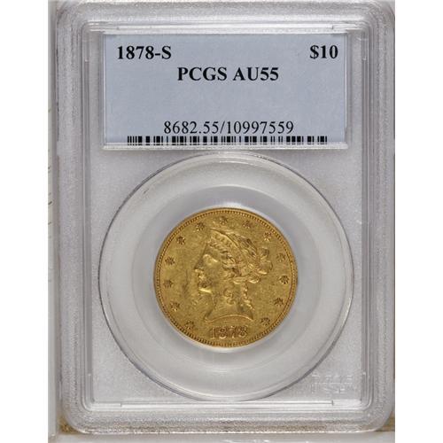<B>1878-S $10 AU55 PCGS.</B></I> A well struck orange-gold example from an original mintage of 26,100 pieces. Only light wear is noted on the devices, and the fields, which display a number of handling marks, have hints of luster. Population: 6 in 55, 4 finer (10/06).<BR><BR><b>Shipping:</b> Coin/Currency (<a target="_blank" href="http://www.heritageauctions.com/common/shipping.php">view shipping information</a>)