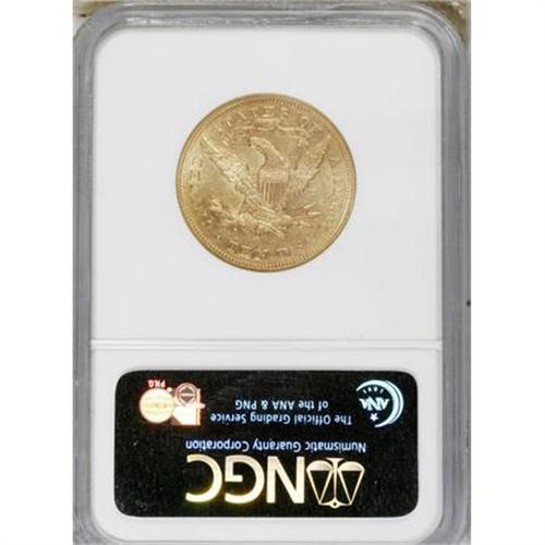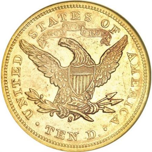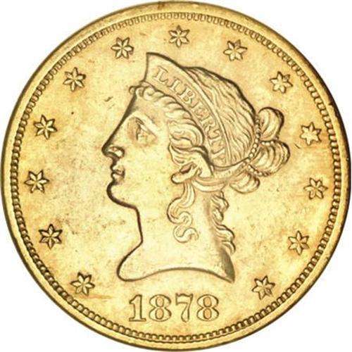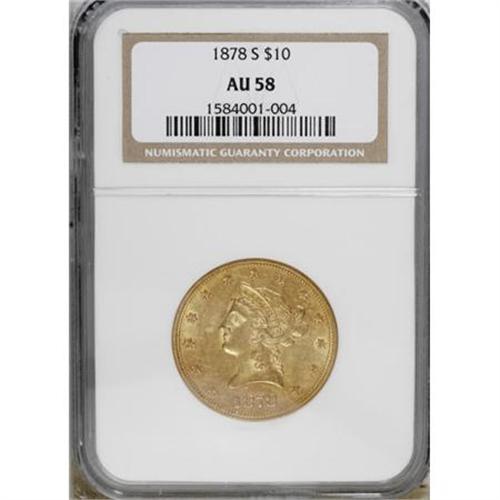 <B>1878-S $10 AU58 NGC.</B></I> A scarce date, especially in higher grades. NGC and PCGS combined have certified a mere six examples as Mint State, and NGC shows 24 coins at the AU58 level with only three pieces in near-Mint State at PCGS (12/07). The current apricot-gold coin is lustrous and free of any distracting problems. <BR><BR><B>Coin Engraver:</B> Christian Gobrecht<BR><BR><b>Shipping:</b> Coins & Currency (<a target="_blank" href="http://www.heritageauctions.com/common/shipping.php">view shipping information</a>)