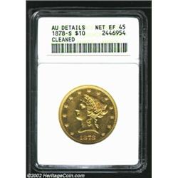1878-S $10--Cleaned--ANACS. AU Details, Net XF45. A polished specimen that has bold details but is unnaturally prooflike. The issue was at one time hoarded due to Akers' frequently quoted assertion "...I can think of no U.S. gold coin of comparable rarity that has been more ignored and lightly regarded than the 1878-S eagle." A scarce issue in all grades. Important notice: We expect to be auctioning lots at the rate of 200-250 per hour. Sometimes eBay Premier live bid software cannot keep up with that pace, so we strongly recommend that you place a realistic proxy bid now as insurance to avoid disappointment. Also please note that all Heritage/CAA lots purchased through eBay Premier carry a 20% Buyer's Premium. Please make sure you read the Terms and Conditions.