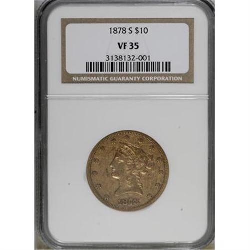 <B>1878-S $10 VF35 NGC.</B></I> NGC Census: (7/188). PCGS Population (14/106). Mintage: 26,100. Numismedia Wsl. Price for NGC/PCGS coin in VF35: $604. (#8682)<BR><BR><B>Coin Engraver:</B> Christian Gobrecht<BR><BR><b>Shipping:</b> Coins & Currency (<a target="_blank" href="http://www.heritageauctions.com/common/shipping.php">view shipping information</a>)