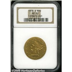 <B>1878-S $10 XF45 NGC.</B></I> A rare issue in all grades that is generally unavailable any finer than XF. This piece is well struck throughout, with light pink color surrounding the devices and no severe abrasions on either side. Population: 49 in 45, 86 finer (2/05).