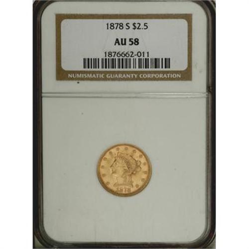 <B>1878-S $2 1/2 AU58 NGC.</B></I> . .. NGC Census: (120/277). PCGS Population (65/117). Mintage: 178,000. Numismedia Wsl. Price for NGC/PCGS coin in AU58: $242. (#7829)<BR><BR><B>Coin Engraver:</B> Christian Gobrecht<BR><BR><b>Shipping:</b> Coins & Currency (<a target="_blank" href="http://www.heritageauctions.com/common/shipping.php">view shipping information</a>)
