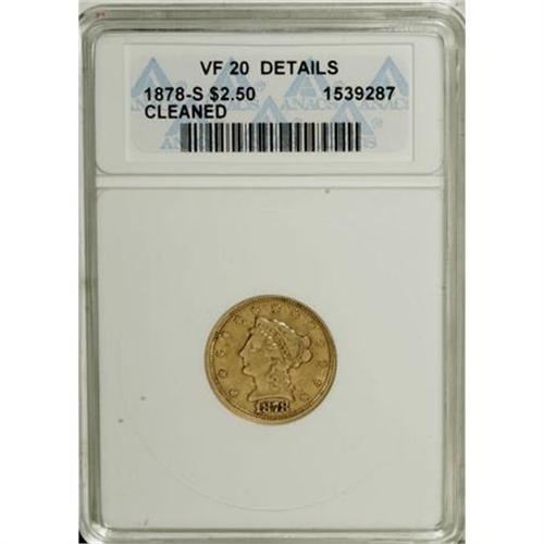 <B>1878-S $2 1/2 --Cleaned--ANACS. VF20 Details.</B></I> NGC Census: (0/420). PCGS Population (0/289). Mintage: 178,000. Numismedia Wsl. Price for NGC/PCGS coin in VF20: $153. (#7829)<BR><BR><b>Shipping:</b> Coins & Currency (<a target="_blank" href="http://www.heritageauctions.com/common/shipping.php">view shipping information</a>)