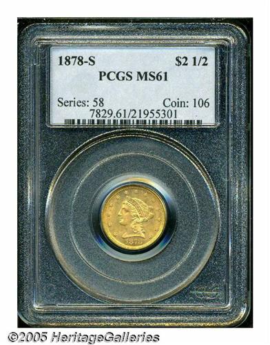 <B>1878-S<$2 1/2> MS61 PCGS.</B></I> Brilliant yellow-gold surfaces with satiny luster and wisps of iridescent toning. Excellent quality for the assigned grade.