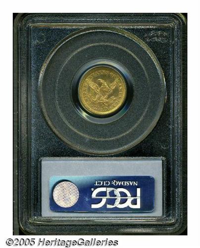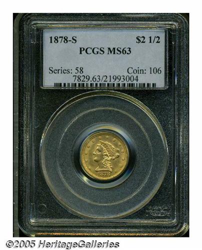<B>1878-S<$2 1/2> MS63 PCGS.</B></I> This is a classic condition rarity, abundant in lower grades including the lowest Mint State grades, but quite rare in higher quality. The MS63 we offer in this sale is sharply struck, with lustrous peach-gold surfaces. A few small contact marks are seen on Liberty's cheek and in the left (facing) obverse field. A small green spot is also noted near the upper-most leaf on the reverse. Population: 23 in 63, 7 finer (6/05).