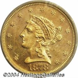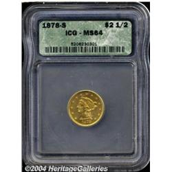 <B>1878-S<$2 1/2> MS64 ICG.</B></I> Mildly prooflike with needle sharp definition under a coating of attractive reddish patina. Since no S-mint Quarter Eagles were produced after 1879, this impressively preserved example would make a fine addition for the collector seeking high grade pieces from each mint. <BR><BR><B>Important notice:</B> Heritage usually auctions material at the rate of 200-250 lots per hour. On some occasions eBay Live bid software or the Internet may not be able to keep up with the pace of the auction. We recommend placing a realistic absentee bid now as insurance to avoid disappointment. Occasionally the auctioneer may eliminate or reject an eBay Live bid, and the auctioneer may also reopen a lot after the close of the eBay live bidding (usually because we missed an audience bid), and may reject your bid even if it shows you as the winning bidder. By bidding via eBay Live, you agree that Heritage may award the lot to another bidder at its sole discretion under the circumstances described above or any other reasonable circumstances. Since eBay bids are not shown to us until we open the lot on the floor, we treat those bids just like floor bids. In most cases the floor responds before the eBay bid is presented to us, due to Internet lag time, so for consistency we have made it a policy that floor bids are always considered first over tie eBay live bids. Also please note that all Heritage lots purchased through eBay Live carry a 20% Buyer's Premium. Please make sure you read the Terms and Conditions before you bid. </span></font></tr></table></td></tr></table>