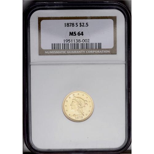 <B>1878-S<$2 1/2> MS64 NGC.</B></I> Lightly toned with bright satiny luster and well struck design features. Two or three minuscule marks are discerned on each side with the aid of a magnifier. A faint red-orange alloy streak extends from the obverse rim below star 1 to the upper edge of Liberty's bust. A conditionally scarce coin at this grade level. Census: 11 in 64, 2 finer (4/06).