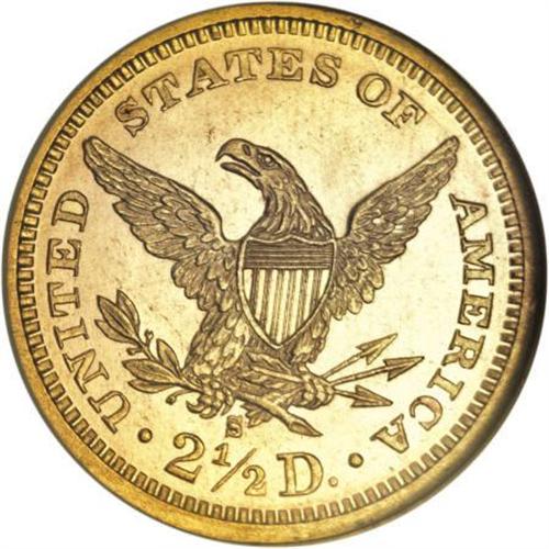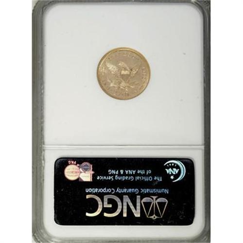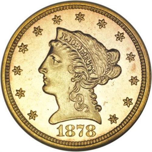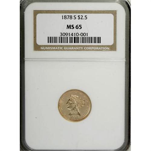 <B>1878-S $2 1/2 MS65 NGC.</B></I> The Garrett-Guth <I>Gold Encyclopedia </B></I>says succinctly of this date, "Although the 1878-S quarter eagle is not a great rarity, it is difficult to locate in gem condition. Just a few examples have been graded at that level. The finest is a single MS-66 coin. Not a single example of the date has been offered at auction in gem condition in the last decade." <BR> Well, here is precisely such a coin, a no-questions Gem striking, with considerable prooflikeness visible on both sides and beautiful yellow-gold coloration. The bold strike completes the attractive package.<BR> A search through our auction archives confirms that this is the single finest graded 1878-S we have ever had the privilege to offer. This is one of only two MS65s graded at NGC, with one finer, while PCGS has certified a single MS65 as the finest at that service (12/07). A highly elusive and underrated coin in Gem condition.<BR><BR><B>Coin Engraver:</B> Christian Gobrecht<BR><BR><b>Shipping:</b> Coins & Currency (<a target="_blank" href="http://www.heritageauctions.com/common/shipping.php">view shipping information</a>)