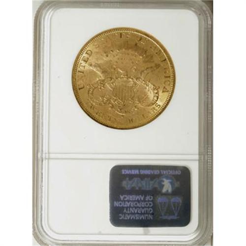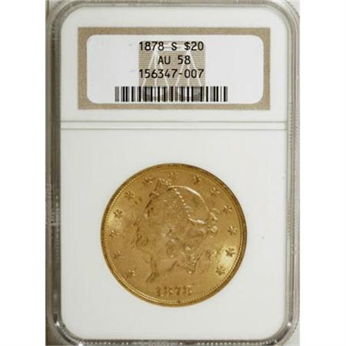 <B>1878-S $20 AU58 NGC.</B></I> NGC Census: (376/637). PCGS Population (166/510). Mintage: 1,739,000. Numismedia Wsl. Price for NGC/PCGS coin in AU58: $805. (#8987)<BR><BR><B>Coin Engraver:</B> James B. Longacre<BR><BR><b>Shipping:</b> Coins & Currency (<a target="_blank" href="http://www.heritageauctions.com/common/shipping.php">view shipping information</a>)