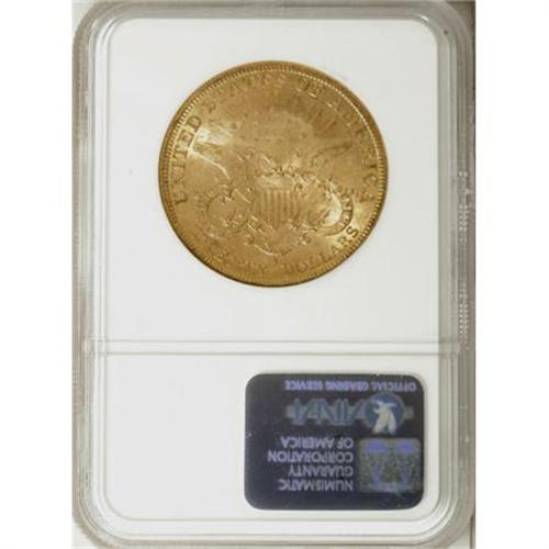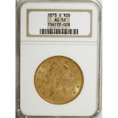 <B>1878-S $20 AU58 NGC.</B></I> NGC Census: (376/637). PCGS Population (166/510). Mintage: 1,739,000. Numismedia Wsl. Price for NGC/PCGS coin in AU58: $805. (#8987)<BR><BR><B>Coin Engraver:</B> James B. Longacre<BR><BR><b>Shipping:</b> Coins & Currency (<a target="_blank" href="http://www.heritageauctions.com/common/shipping.php">view shipping information</a>)