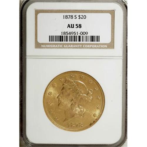 <B>1878-S $20 AU58 NGC.</B></I> NGC Census: (376/637). PCGS Population (166/510). Mintage: 1,739,000. Numismedia Wsl. Price for NGC/PCGS coin in AU58: $805. (#8987)<BR><BR><B>Coin Engraver:</B> James B. Longacre<BR><BR><b>Shipping:</b> Coins & Currency (<a target="_blank" href="http://www.heritageauctions.com/common/shipping.php">view shipping information</a>)