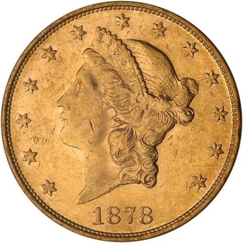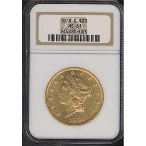 <b>1878-S $20 Liberty. NGC graded MS61.</b> Lustrous and of average strike on the stars <b>(PCGS # 8987)</b> <i>