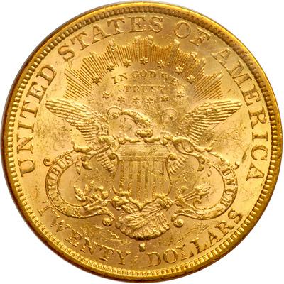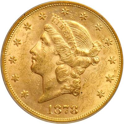 1878-S $20 Liberty. PCGS graded MS-60. Old Green Holder. Golden shades blanket both sides. Frosty. A few marks on the cheek and in the fields (PCGS # 8987) .