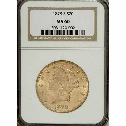 1878-S $20 MS60 NGC. NGC Census: (225/387). PCGS P