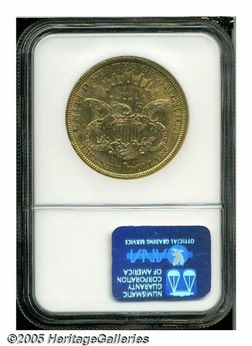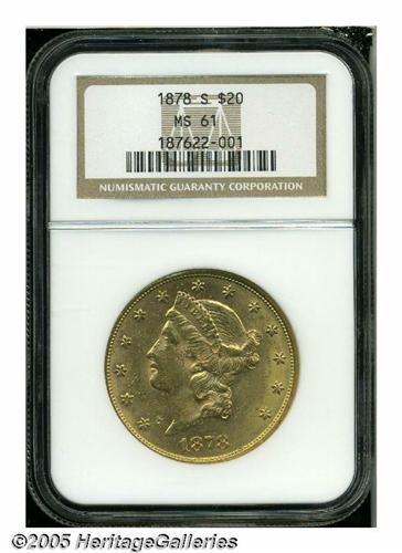 1878-S $20 MS61 NGC. Mostly salmon-pink in color,