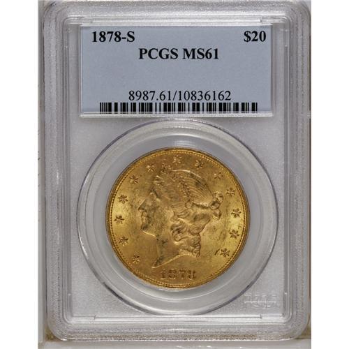 <B>1878-S $20 MS61 PCGS.</B></I> Softly lustrous with green copper staining on the obverse devices. The well-defined devices have numerous small abrasions, as do the fields.<BR><BR><b>Shipping:</b> Coin/Currency (<a target="_blank" href="http://www.heritageauctions.com/common/shipping.php">view shipping information</a>)