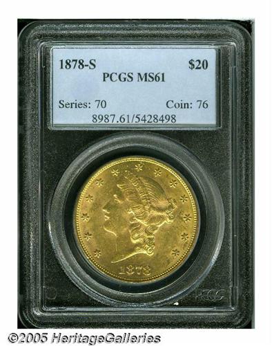 <B>1878-S<$20> MS61 PCGS.</B></I> This lustrous Type Three Twenty has a comparatively clean reverse and a typically marked obverse. Sharply struck, and scarce in higher Mint State grades.