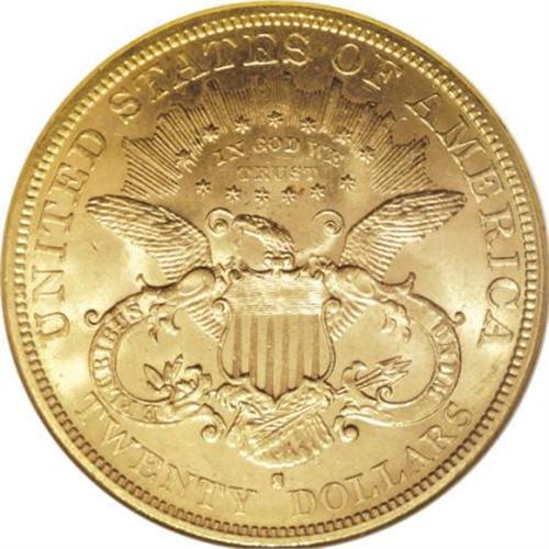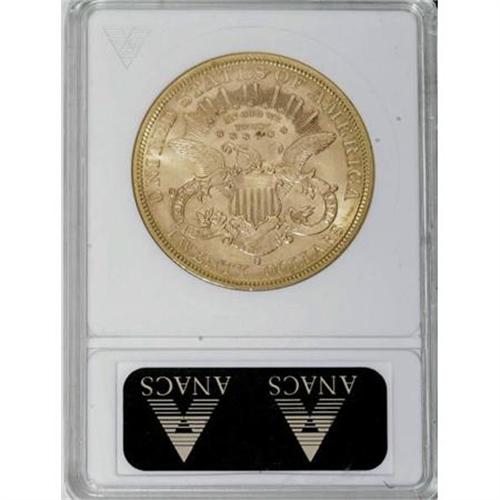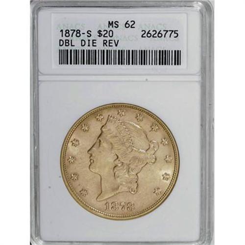 <B>1878-S $20 MS62 ANACS.</B></I> Doubled Die Reverse, as noted on the ANACS encapsulation. The doubling is most prominent at IN GOD WE TR and E PLURIBUS UNUM, although traces of doubling can also be seen on the scrollwork surrounding the eagle and the arrow feathers. The <I>Cherrypickers' Guide </B></I>fourth edition does not list this piece, but it deserves a place therein, as the doubling is quite prominent. This piece displays nice yellow-gold surfaces with good luster and a few light abrasions consistent with the grade assigned.<BR><BR><b>Shipping:</b> Coins & Currency (<a target="_blank" href="http://www.heritageauctions.com/common/shipping.php">view shipping information</a>)