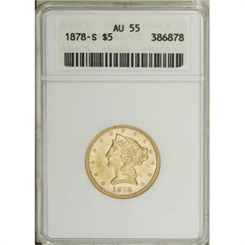 <B>1878-S $5 AU55 ANACS.</B></I> NGC Census: (61/237). PCGS Population (34/82). Mintage: 144,700. Numismedia Wsl. Price for NGC/PCGS coin in AU55: $260. (#8347)<BR><BR><B>Coin Engraver:</B> Christian Gobrecht<BR><BR><b>Shipping:</b> Coins & Currency (<a target="_blank" href="http://www.heritageauctions.com/common/shipping.php">view shipping information</a>\)