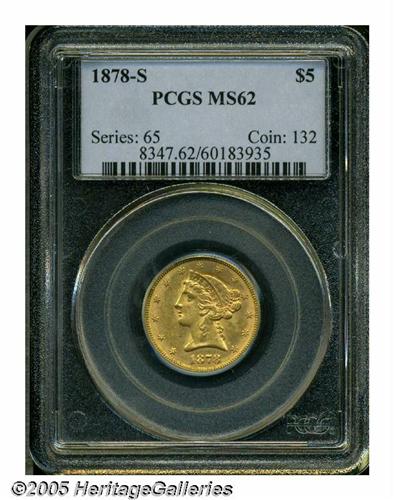 <B>1878-S<$5> MS62 PCGS.</B></I> Lustrous surfaces with rich pink-orange and lime-green coloration and minimal abrasions for a coin of this grade. A bit softly struck in the centers, with sharp details on the peripheral stars. Population: 15 in 62, 6 finer (5/05).