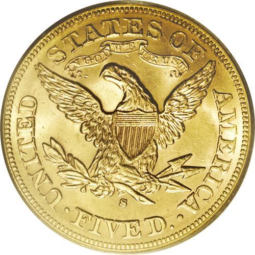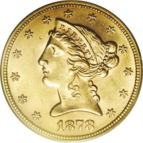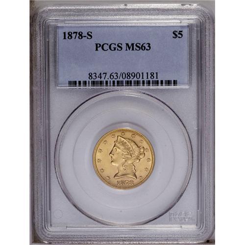 <B>1878-S<$5> MS63 PCGS.</B></I> While scarce in the lower grades of Uncirculated, the 1878-S can be located with some persistence in MS60 to MS62 condition. However, there is a sharp dropoff in availability at the MS63 level with only 10 coins certified as such by the two major services, and five finer (3/06). This is a sharply struck coin that displays strong mint luster with a noticeable overlay of reddish patina. Lightly marked for an MS63. <BR><BR><B>Important notice:</B> Heritage usually auctions material at the rate of 200-250 lots per hour. On some occasions eBay Live bid software or the Internet may not be able to keep up with the pace of the auction. We recommend placing a realistic absentee bid now as insurance to avoid disappointment. Occasionally the auctioneer may eliminate or reject an eBay Live bid, and the auctioneer may also reopen a lot after the close of the eBay live bidding (usually because we missed an audience bid), and may reject your bid even if it shows you as the winning bidder. By bidding via eBay Live, you agree that Heritage may award the lot to another bidder at its sole discretion under the circumstances described above or any other reasonable circumstances. Since eBay bids are not shown to us until we open the lot on the floor, we treat those bids just like floor bids. In most cases the floor responds before the eBay bid is presented to us, due to Internet lag time, so for consistency we have made it a policy that floor bids are always considered first over tie eBay live bids. Also please note that all Heritage lots purchased through eBay Live carry a 20% Buyer's Premium. Please make sure you read the Terms and Conditions before you bid. This lot is being auctioned in conjunction with a live floor auction by Heritage Galleries & Auctioneers. All final auction and invoice information will be supplied by Heritage Galleries & Auctioneers, and all other information should be considered preliminary. Lot:2797 <BR><BR><B>Winning Notification and Billing:</B> After the FINAL session in this auction is complete, Heritage will send e-mail and snail mail invoices. This process normally takes several days. All final auction and invoice information will be supplied by Heritage Galleries & Auctioneers, and all other information should be considered preliminary. <BR><BR>This auction will be conducted on a live auction floor and over the Internet through eBay Live. If you choose to place an absentee bid, please take a moment to <font color='#0000ff'><u><a href='http://pages.ebay.com/liveauctions/help/before/laabsentee.html'>learn how eBay Live absentee bidding works</a></u></font><font color='#000000'>