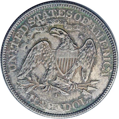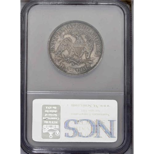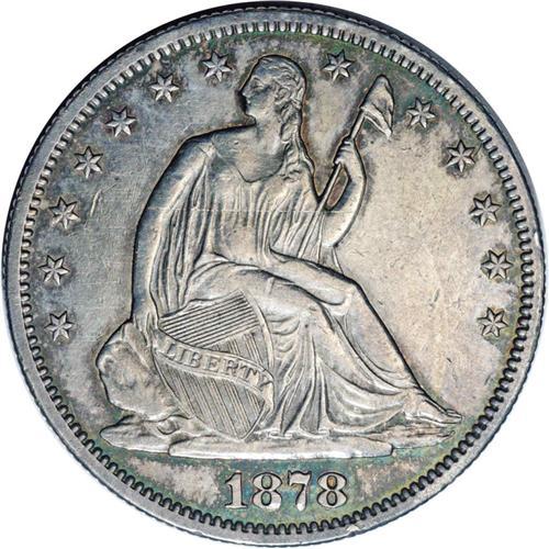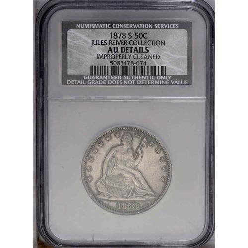<B>1878-S<50C>--Improperly Cleaned--NCS. AU Details.</B></I> A legendary rarity in the Seated half series. The mintage was a mere 12,000 pieces, all struck before the mint's equipment was pressed into full time service producing Morgan dollars. As a result, surviving examples of the half dollars are very rare. According to our records, only 33 specimens have been offered in public sales during the past 30 some years. This specimen displays sharp design detail. The surfaces are bright and finely hairlined, and are retoning aqua marine in isolated areas, particularly along the borders. We also note a horizontal pinscratch across Liberty's midsection between her two arms.