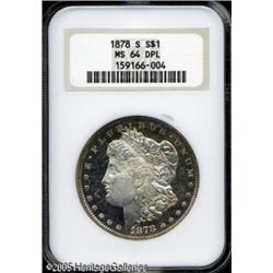 <B>1878-S<img border='0' src='http://www.heritagecoins.com/images/star.gif' width=10 height=10>$1 MS64 Deep Mirror Prooflike NGC.</B></I> Well struck with dynamic reflectivity flashing from the dark champagne-gold fields, and crisp details on the richly frosted white devices. The cheek and the eagle's breast are very clean, but numerous small field abrasions restrict the grade to MS64. Population: 123 in MS64 Deep Mirror Prooflike, 25 finer (1/05). Lot:9915