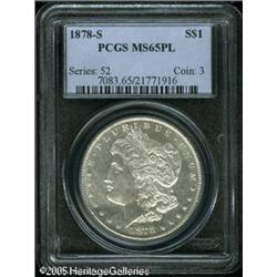 <B>1878-S<img border='0' src='http://www.heritagecoins.com/images/star.gif' width=10 height=10>$1 MS65 Prooflike PCGS.</B></I> Well struck with dazzling reflectivity in the fields, and a basically untoned Gem that has some slight cloudiness on each side. A small abrasion and several roller marks (as struck) on Liberty's chin, prevent an even higher grade assignment. Population: 101 in 65 Prooflike, 7 finer in Prooflike (1/05). Lot:9914