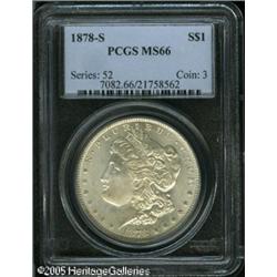 <B>1878-S<img border='0' src='http://www.heritagecoins.com/images/star.gif' width=10 height=10>$1 MS66 PCGS.</B></I> Sharply struck with frosty silver luster and pale champagne toning. PCGS has only certified 20 finer non-prooflike examples. Lot:9911