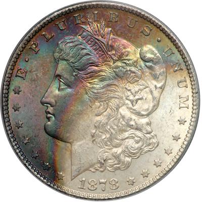 1878-S Morgan Dollar. PCGS graded MS-64. The obverse displays deep rainbow toning on about half of the coin (PCGS # 7082).