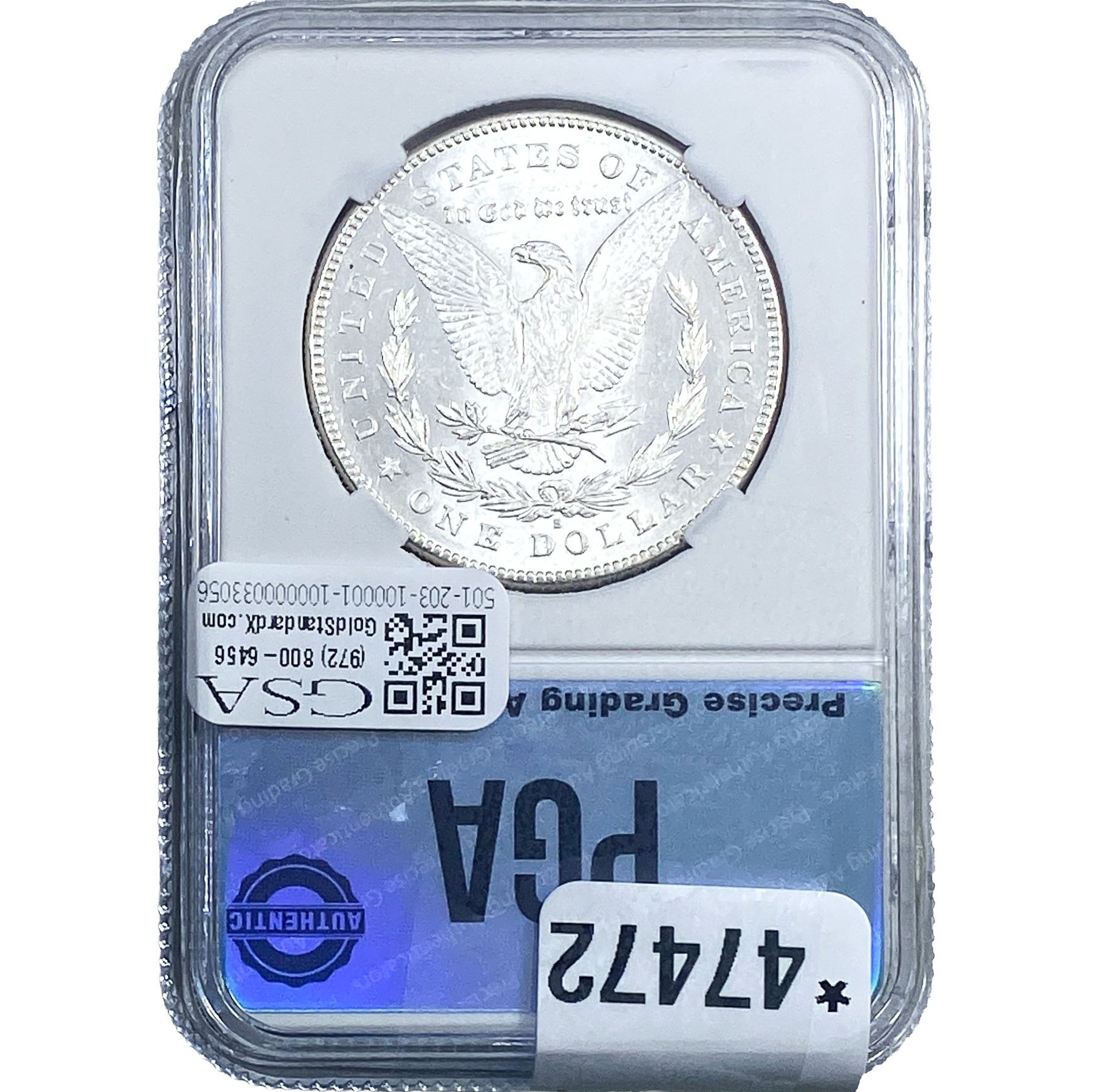 COINS AND CURRENCY LISTED IN GSA’S CATALOG AS GRADED AND ENCAPSULATED BY PCGS, NGC, ANACS, ICG, PCGS CURRENCY, PMG, PCGS BANKNOTE GRADING, CMC OR ANY OTHER THIRD-PARTY GRADING SERVICE ARE LIKEWISE SOLD “AS-IS” EXCEPT AS EXPRESSLY SET FORTH HEREIN. ALL THIRD-PARTY GRADING SERVICE GUARANTEES, INCLUDING AUTHENTICITY, ARE THE SOLE RESPONSIBILITY OF THE THIRD-PARTY GRADING SERVICE AND NOT WARRANTIES OR GUARANTEES OF GSA. BIDDERS SHOULD CONTACT THESE THIRD-PARTY GRADING SERVICES DIRECTLY WITH RESPECT TO ANY CLAIMS OR QUESTIONS THEY MAY HAVE CONCERNING THEIR GUARANTEES AND WARRANTIES. BIDDERS ACKNOWLEDGE AND AGREE THAT AUCTIONEER IS NOT BOUND BY OR LIABLE FOR ANY OPINION OR CERTIFICATION BY ANY THIRD-PARTY GRADING SERVICE. REMOVAL OF A PRODUCT FROM ITS PROTECTIVE CASING OR HOLDER OR ALTERATION OF ANY COIN HOLDER WAIVES ALL RIGHTS CONCERNING THE PRODUCT CONTAINED THEREIN.